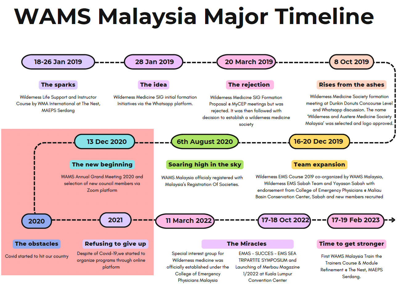 The Wilderness and Austere Medicine Society of Malaysia (WAMS) was established in 2019 by a group of passionate emergency physicians, wilderness medicine enthusiasts, outdoor educators, doctors, and paramedics. The society was officially registered with the Registrar of Societies (ROS) on 6th August 2020.